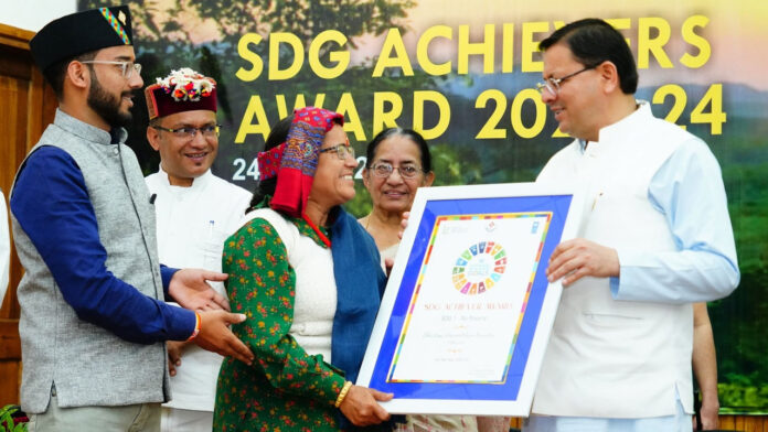 देहरादून। मुख्यमंत्री पुष्कर सिंह धामी ने सोमवार को मुख्यमंत्री आवास स्थित मुख्य सेवक सदन में एस.डी.जी एचीवर अवार्ड समारोह में 3 व्यक्तियों, 09 संस्थानों और 04 औद्योगिक प्रतिष्ठानों को एसडीजी अचीवर अवार्ड से सम्मानित किया। पिछले वर्ष के एसडीजी अवार्ड से पुरस्कृत व्यक्तियों और संस्थानों द्वारा की जा रही अभिनव पहलों की पुस्तक ‘अग्रगामी 2.0’ और एसडीजी इंडेक्स उत्तराखण्ड 2023-2024 का लोकार्पण भी इस अवसर पर मुख्यमंत्री ने किया।